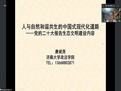 学科专业特点,以《人与自然和谐共生的中国式现代化道路——党的二十大报告生态文明建设内容》为题,从党的二十大报告对生态文明建设的概述、生态文明内涵的新拓展新观点、生态文件建设的新要求新任务以及开创新时代社会主义现代化强省生态文明建设的新局面四个方面展开讲述。唐斌尧的报告深入浅出,旁征博引,通过大量数据阐明了环境与健康的关系;以济南小清河综合治理为例,并结合自身的课题研究成果,生动地展现了新时代十年生态文明建设的伟大成就。通过宣讲报告,成人av