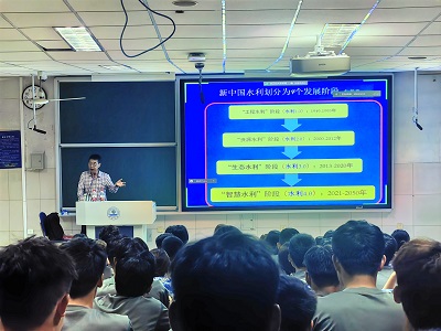 李贵宝教授以《水利事业大有可为》为题,围绕“涉水管理与单位”“水利事业为美丽中国做支撑”和“给同学们的一点建议”三个方面进行了深入阐述,为同学们介绍了我国水利事业中的各类涉水管理单位发展情况,引导同学们充分了解我国水利事业发展现状及未来发展方向。同时,他从国家、单位、个人三个层面分析了“美丽中国”框架下水利事业的现状与未来,阐释了人与自然和谐共生的发展理念。他认为,大水(利)行业的未来发展趋势倾向于区域拓展、产业链延伸、行业拓展、信息技术 BIM应用,并号召同学们在大学中努力读知识、读能力、读智慧、读人格,为美丽中国建设添砖加瓦。