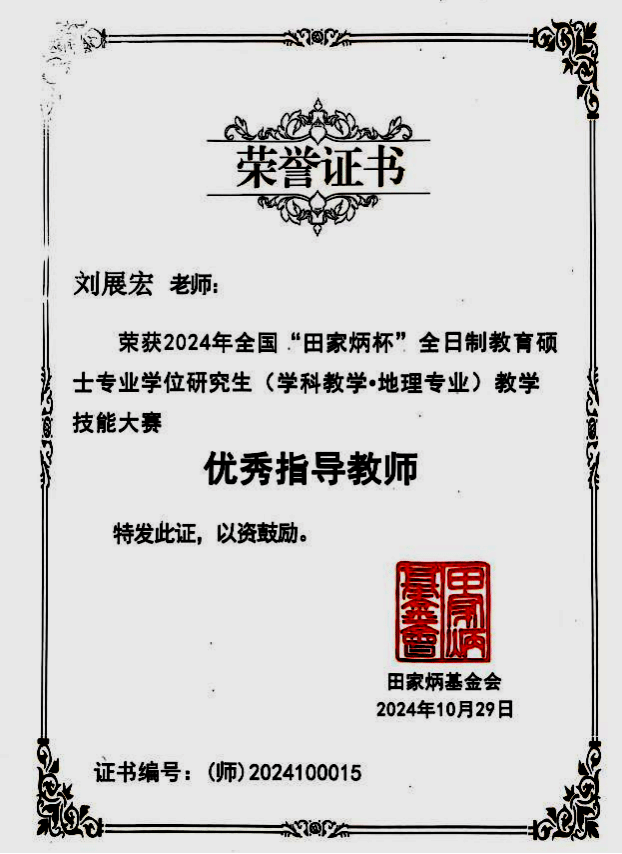 2023级学科教学(地理)专业研究生郭心怡荣获全国一等奖,刘展宏教师获“优秀指导教师”奖。