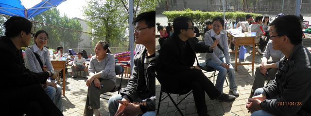 的副书记陈卫东、学办老师付颖颖在排球场休息区与学生会,自律会主席进行了一次亲切的交谈。