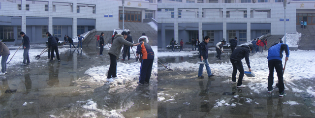 09级各班班委在实验楼前集合,在成人av自律会同学的安排下,扫雪工作全面展开。由于持续低温的影响,道路积雪大部分结冰,同学们自带工具积极配合组织人员的安排,干劲十足。大约一个小时后,实验楼前的积雪清扫完毕。同学们激情不减,又开始自觉清扫校园道路,充分展现了成人av学生志愿服务他人的良好品质。
