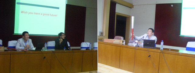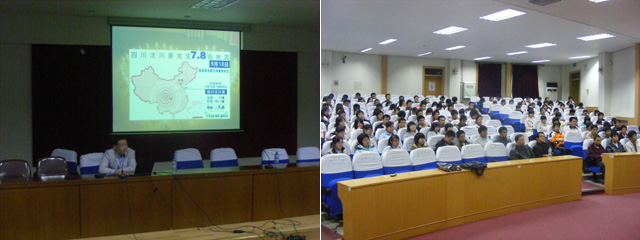 报告会的会场气氛浓重,同学们的掌声持久而热烈。张济主任以其在灾区半个多月的亲身经历,饱含深情地向大家讲述了抗震救灾的亲身经历和真切感受,深深感染了在座的广大师生;作为北京奥运会火炬手,张济主任还带来奥运火炬,给了同学们零距离接触火炬的机会。同学们兴奋不已,纷纷与火炬合影留念。报告会结束后,张主任还与一位家在四川的同学进行了亲切地交谈。