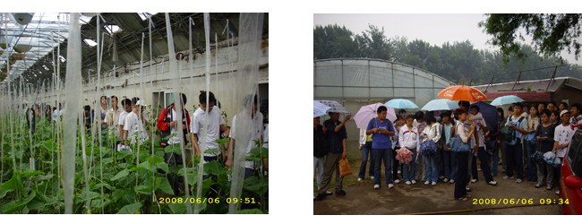 照常是上午8点,同学们早已聚集在了集合点,随着公交车的启动,同学们又踏上了新的征程。在农科院蔬菜研究所,农科院的王老师向同学们介绍了研究所的历史及发展历程,并带领同学们逐一参观了研究所的各种试验田,王老师带领同学们进到黄瓜新品种培育基地的温室内,让同学们见识新品种的生产地。王老师还向同学们介绍研究所近几年取得的科研成果以及各种科研成果的在实际生产中推广。虽然天下着雨,但风雨阻挡不住同学们的求知欲,同学们一个个都被研究所中的新奇事物所吸引,积极向老师发表提问,努力弄清楚自己的疑惑。
