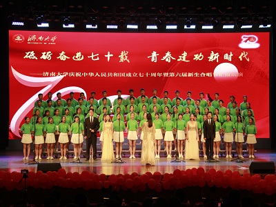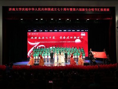 表达自己热忱的爱。校歌结束后,四位旗手迈着正步,高举国旗走至台前,使人为之振奋。自选曲目《再一次出发》的旋律响起,男演唱者声音浑厚,女演唱者声音轻灵,在磅礴气势中讲述中华民族70周年的伟大历程,四位舞者轻盈踏上舞台,翩翩舞步中让人体会到祖国的腾飞之势,最后几位身着不同职业服装的同学上台共同歌唱,表现出在各行各业的努力建设下,中国愈发强大。观众也沉醉地跟唱,拳拳爱国之心溢于言表。