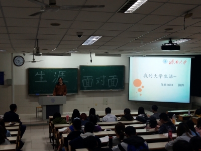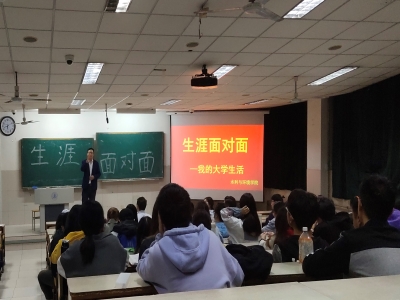 于第二教学楼102教室举办以“生涯面对面—我的大学生活”为主题的系列活动。2016级辅导员白健老师,保研至中科院成都山地灾害和环境研究所的柳烨学姐和保研到华东师范大学的王栋学姐出席该活动。