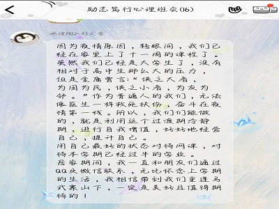 各班自由选择交流平台,围绕相同的话题,展开了不同的讨论。为顺利召开心理班会,还有各班班干部会前认真查阅资料,做好了充分的准备,同学们也是十分配合,互相交流答疑。大部分班级分成这样几个板块:当前疫情趋势、疫情期间学生心理可能出现的不良反应、应对心理问题的解决办法等等,同时还分享了疫情期间的生活体验、网课学习经验以及对校园生活的憧憬向往。班会结束后,班长选取2-4名同学录制心灵寄语微视频,优秀作品将在璧水环林公众号上进行展示。