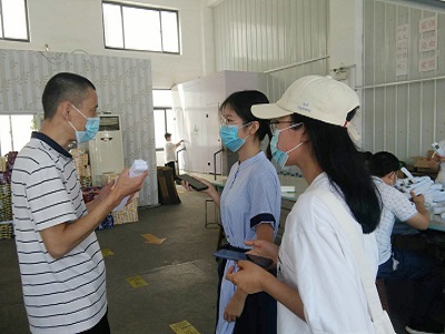 通过与就业服务中心的工作人员交谈,团队成员进一步了解到,该残疾人辅助性就业服务中心主要为智力残疾人提供工作岗位。他们的主要工作是把已经制作完成的跆拳道腰带进行折叠打包,部分员工还负责修剪线头。随后,成员们也向在场的员工们学习了如何折叠腰带。跆拳道腰带的折叠并不是简单的随意对折,而是需要先量出腰带折叠部分的长度,按照这一长度将腰带等分按次序向内对折并整理,最后与规定的长度进行比量调整。经过员工简单的培训,成员们也帮助他们完成了部分工作。