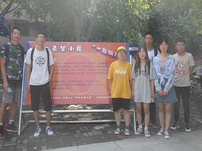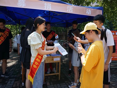 环抱碧水青年志愿者协会成员们于八食堂广场处参与“济大希望小屋”募捐活动。