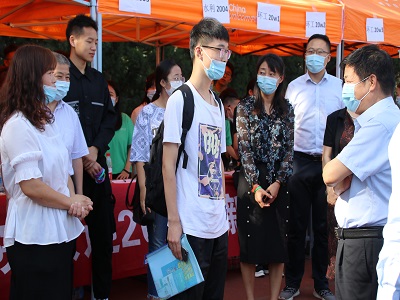 迎新工作进行实地视察,亲切地与新生交谈,并且与新生及新生家长合影留念。