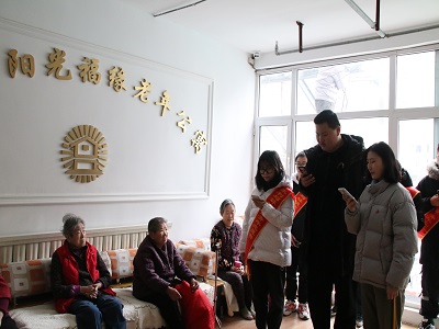 上午9点,10名志愿者准时到达阳光福缘老年公寓,与公寓管理人员取得联系,并了解公寓居住老人身体情况后,志愿者们进入老年公寓内部。在公寓中,志愿者们两两一组与老人进行聊天,听老人们讲述他们年轻时的故事,帮老人捶捶背揉揉腿。简单的交流过后,青年志愿者们表演歌曲《我和我的祖国》和诗朗诵《我残损的手掌》。精彩的表演获得老人们的热烈的掌声,也激起老人们表演的兴趣,多才多艺的老人们弹起琴唱起国粹京剧豫剧,虽都年过花甲却依旧精神抖擞地为我们表演地方民谣舞蹈《拉地瓜》,歌声嘹亮悠远,记忆犹新。此后,志愿者们走上三楼大厅为行动不便的老人表演歌曲《我和我的祖国》,其中一位老人被振奋的歌声所感动,时而笑时而哭。志愿活动在志愿者的歌声与老人的欢笑声中逐渐接近尾声,在志愿者与老人们合照中环抱碧水青年志愿者协会走进阳光福缘老年公寓活动画上完美的句号。