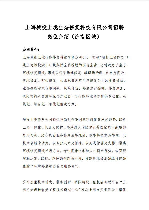 上海城投上境生态修复科技有限公司招聘信息