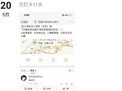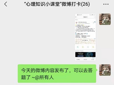 水环心动力”,坚持每天认真学习微博发布的心理知识,根据自己对问题的理解和心理知识的掌握情况在评论区进行做答,并将自己答题的截图发布在微信小圈子“‘心理知识小课堂’打卡圈”进行打卡。新颖的线上活动形式大大激发了同学们的积极性,同学们踊跃参加答题,董庆春、董怡彤、李倩、倪圆圆、吴向楠、尚凯月等十一位同学坚持每天答题打卡达十天及以上,其中董庆春同学的正确率最高。