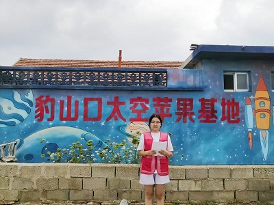 成员王一琳来到栖霞市豹山口苹果基地。她首先参观了该村有关“航天苹果”的墙体文化设计,一幅幅墙画也彰显了豹山口村对苹果产业的自信和骄傲。随后,王一琳跟随当地的农民亲身体验了套袋等管理果园的其他种植过程,由于没有经验,她的动作很生疏,在完成一整棵树的套袋过程后,已经感觉浑身酸痛。通过和村民交流她了解到,村农民一天可以装完2000个袋子,只有以这样的速度工作才能有效保护苹果的果面,保护着色,保持果实的新鲜度,王一琳深深感受到了劳动的不易。