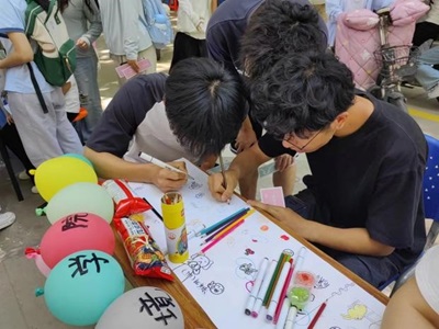 活动特意来围观的学长学姐......他们的心情有期待、有疲惫、有兴奋,却都在拿起画笔的一刻转变为了平静和认真,用心勾勒出自己喜欢的卡通角色、用缤纷的彩笔描绘当下的心情写照,最后脸上挂起满意的微笑,打卡离开。整整一上午过去,游园的同学带着好奇而来,带着笑容离去,直至活动结束,工作人员最终收获了由5张画纸贴合起来的长长的画卷。这幅承载了同学们多彩心情的画卷由成人av