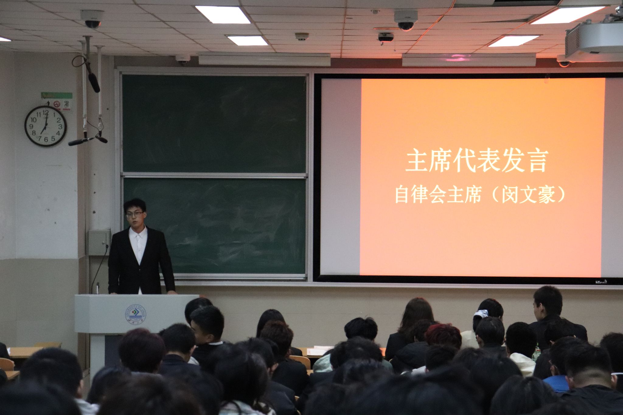 会议伊始,主持人介绍参会人员并阐明大会主旨。随后,主席代表闵文豪上台发言,对新成员的加入表示欢迎并明确自律会下一阶段工作,表明将带领团队恪尽职守,有序推进各项工作落地。紧接着,部长代表褚学哲上台发言,分享了自己的任职经验与成长感悟,并表示未来将以身作则,细化工作流程,提升服务质效,助力自律会规范有序运行。最后,干事代表辛子璇上台发言,表达了将在自律会认真履职的决心,未来将以饱满的热情投入各项工作中。