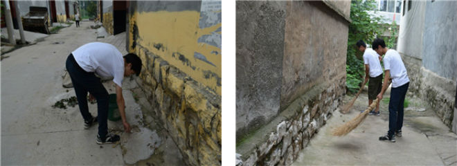 “探访郭庄保护家园环境”社会实践团为了更好的弘扬此次活动的实践和志愿者精神,团队成员清扫村里的卫生。