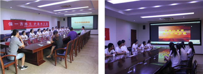 “泉水之源”济南市南部山区生态环境调研团邀请卧虎山水库管理处总工程师吴深老师、工程科科长王卫东老师为队员们召开节水环保座谈会。卧虎山水库工程师翟学英、助理工程师刘军参加座谈会。