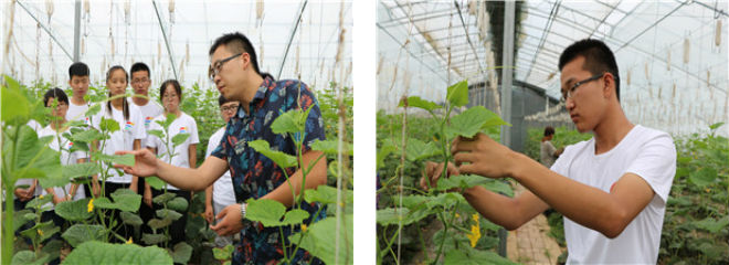 辅导员白健老师的带领下到达劳作地点,并认真向专业技术人员学习大棚黄瓜的“搭架”、“引蔓”、“整枝”技术。随后,同学们共同参与,帮助农民阿姨一起工作。由于缺乏工作经验,志愿者们起初只能一个叉一条枝的进行劳作,随着学习和实践的积累,同学们都能熟练的对黄瓜进行作业。过程中,白老师向团队成员讲解了“搭枝”、“引蔓”、“整枝”的科学原理,以及对黄瓜产量的益处和瓜藤高度的影响。同学们在学习知识的同时也收获到劳动的幸福与成就感,切实做到知识与实践相结合。