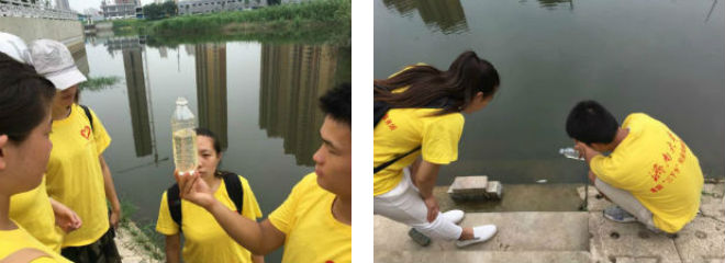 实践团成员早早到达湿地公园后,将事先准备好的采样工具放好。在队长的带领下,“绿之光”社会实践团成员们首先在湿地公园沿湖行走,通过肉眼的观察粗略评估湖水的水质状况。在观察的过程中,队员们发现,不同位置的水质状况差别较大,有些部分湖水较为清澈,有些位置的湖水却飘满垃圾。下午,在对水质有了大致了解后,队员们从湿地公园的不同位置对湖水进行采样,并对取得的水样进行更详细的观察与分析。队员们积极探讨,踊跃说出自己的看法,并认真记录分析所得数据。