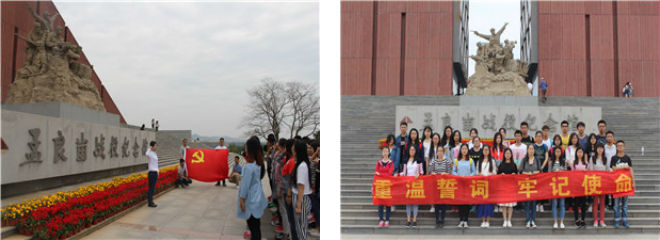 孟良崮战役的胜利,是中国人民革命战争史上的一座丰碑。学生党员们在讲解员的带领下参观孟良崮战役纪念馆,通过沙盘演示、历史图片、文献资料、战争实物展示,全面了解孟良崮战役过程,深入感受山东解放区人民踊跃支前、无私奉献的感人事迹,不仅提高了对群众路线的思想认识,更坚定了“做合格党员”的崇高志愿。“青山处处埋忠骨”,一座座革命烈士的墓碑提醒着同学们,革命胜利来之不易。在孟良崮战役纪念馆前,全体学生党员面向党旗,重温入党誓词,“我志愿加入中国共产党,拥护党的纲领、遵守党的章程……”。