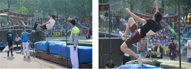 袁梦飞、李言同学拼尽全力的一跃,决定了最后的胜利,取得了男子甲组跳高第二、三名的优异成绩