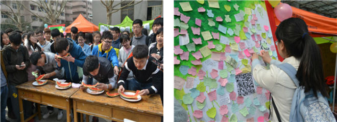 全体女生征集心愿贴在“水果心愿墙”上面。活动开始以后,参加活动的男生根据自己的能力撕下便利贴为女生实现愿望并送上真挚的祝福话语,许多女生表示从这次活动中收获了诚挚的友情。与此同时,水果趣味游戏活动也在热火朝天的进行,活动共分为比赛削苹果皮、计时吃水果和创意水果拼盘三个部分。同学们积极踊跃的参与比赛,现场气氛十分活跃。身穿水果玩偶衣服的同学用滑稽的动作为参赛者加油助威,参赛的同学们也个个拼尽全力,不顾形象的吃着水果,将现场的气氛引向一个又一个的高潮。