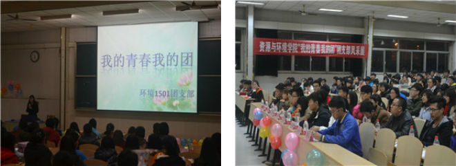 晚上7点,风采展正式开始,主持人首先对活动规则进行了详细介绍,并为同学们播放了一段精美的VCR,点燃现场的气氛。随后各班团支部代表上台播放了精心准备的PPT,一张张同学们进入大学以来的照片让现场的气氛变得温馨而感动,丰富多彩的内容不仅表现了每个班级对团知识的了解也表达了同学们内心对团组织的尊敬和热爱。比赛间隙,主办方精心准备的节目将现场的气氛引向一个又一个的高潮。最终经过一番激烈的角逐之后,环境三班夺得了桂冠,环境一班、环境四班获得了第二名的好成绩,环境二班、地科一班和地科二班不相上下,分别获得第三名。活动最后,获奖团支部代表与嘉宾、评委合影留念。