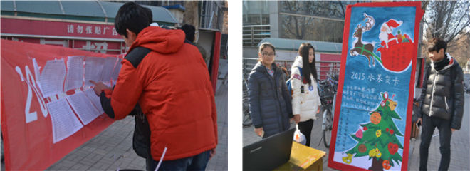 承办,以低碳环保的理念,联合了国内300余所高校共同参与。同学们可选择苹果、橙子等不同水果种类通过创意涂鸦,寄给想送的其他高校朋友,朋友会在圣诞节当天收到创意水果和满满的祝福。活动不仅通过选择水果作为原材料来减少纸质、包装的使用,同时与全国300多所高校合作,相互提供订购信息并及时帮助同学们送达礼物,达到节省运输费用、时间和环保的目的。同学们对此次创意活动充满热情,在活动地点前来参加的同学络绎不绝,都想通过这种独特环保的方式给远方的朋友送去温暖,希望他们在圣诞当天收获一份惊喜与感动。