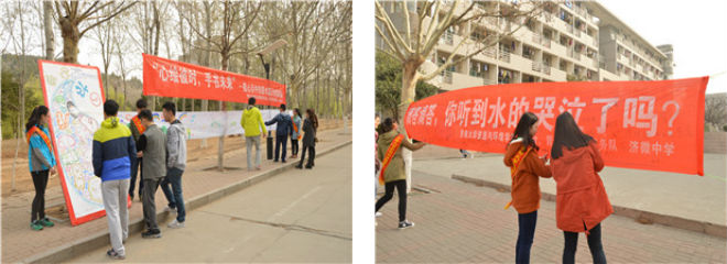 学生创作。各个图标寓意深刻,将节约用水形象化的烙入人心。节水条幅上则满是签名,来往学生在参观完后纷纷留下自己的决心,让本次活动更具现实意义。