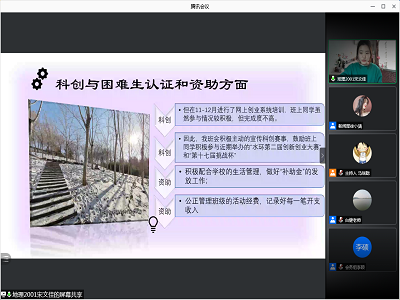 班委职能分工》文件精神,加强班级凝聚力、向心力,细化班委职能分工和学生干部队伍建设,提升各班委的综合素质,本科2020级特开展班级工作述职会议。本次述职大会于2021年2月9日线上进行,成人av