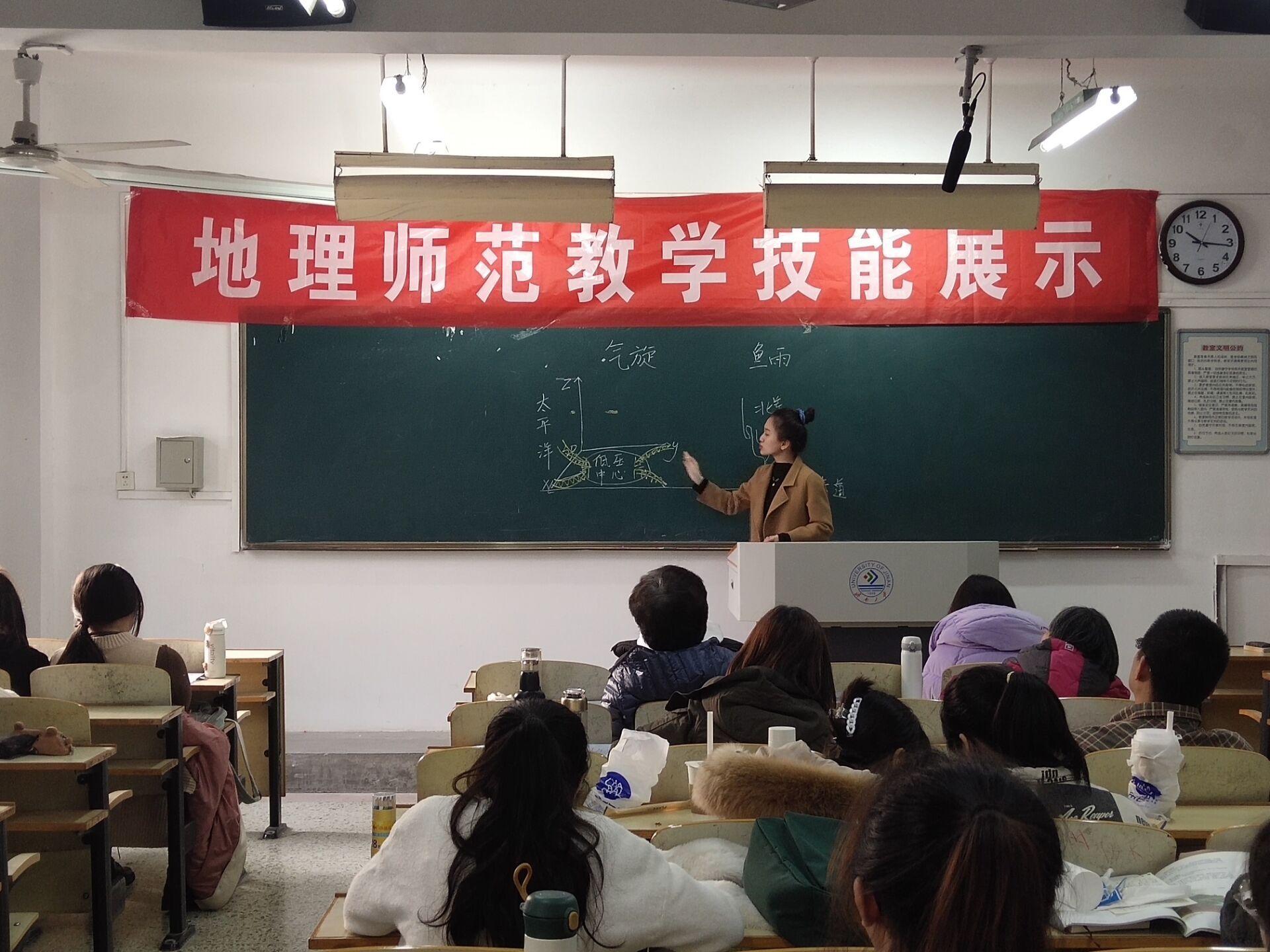 地理师范生教学技能展示活动。本次活动评委为地理科学与规划系教授周保华老师,系主任、副教授宋鹏老师,副教授刘展宏老师、罗芳老师等,参与者为2019级全体地理科学师范类学生。