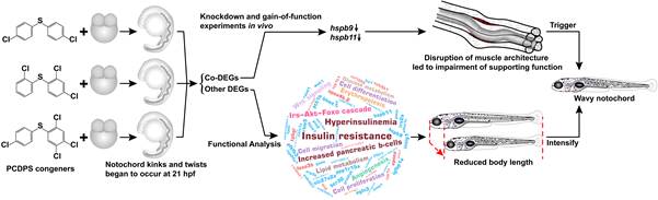 通过与南京大学、华中农业大学、安徽大学、中国水产科学研究院淡水渔业研究中心、加拿大卡尔顿大学、加拿大萨斯喀彻温大学、加拿大环境及气候变化部国家野生动物研究中心等单位合作,通过体内、体外试验、报告基因、转基因斑马鱼、分子动力学模拟、转录组分析、基因敲降、功能获得性突变、胚胎显微注射、扫描电镜等方法,揭示了PCDPSs致脊椎动物死亡(图1)和发育早期脊索波浪形弯曲畸形(图2)的分子/原子机制。研究结果证实了PCDPSs能够以时间和浓度依赖的方式在斑马鱼体内富集,并引起浓度依赖的死亡率和cyp1s mRNA表达的显著升高;发现了PCDPSs能够在COS-7细胞中诱导产生显著的Ahr2-LRG活性,而且受试PCDPSs的半数致死浓度与cyp1s mRNA的表达和Ahr2的激活水平显著相关;揭示了Ahr2配体结合域内的6个关键氨基酸位点(Phe300,Tyr327,Ile330,Cys338,His342和Leu353)与配体类二噁英化合物的相互作用力差异,可能是二噁英和类二噁英化合物对斑马鱼毒性差异的主要原子水平致毒机制;揭示了hspb9和hspb11转录的下调可能是引发PCDPSs导致脊椎动物发育早期脊索波浪形弯曲畸形的分子机制,而胰岛素相关的Irs–Akt–FoxO信号级联引起的生长发育迟缓加重了这种脊索畸形;支持了持久性有机污染物的体内蓄积加重了全球范围的胰岛素抵抗及相关疾病发生的观点。这些研究结果为PCDPSs及其它潜在环境类二恶英化合物的环境风险管控等提供了重要的理论支持及数据参考。