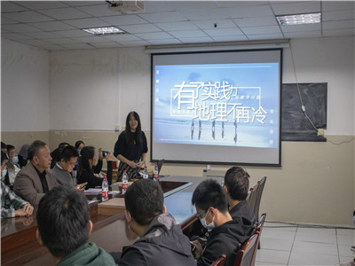 教学工作的支持表示感谢。随后,燕老师以“有了实践力,地理不再冷”为题从什么是地理、什么是地理教育、教与学的关系等方面开始演讲。在演讲的过程中燕老师结合教学经验和工作中的课题研究经历向同学们讲述了教与学的关系,希望地理教育能够实现能力向情感的转变。明确学生需求,培养学生的地理实践力。同时燕老师依托教学实际案例向大家讲解了什么是地理实践力。随后,地理系学生代表展示了一堂微课,燕老师给予点评。最后,宋鹏老师做总结讲话,对燕老师精彩的演讲和点评感谢,同时希望能够加强与燕老师的合作。